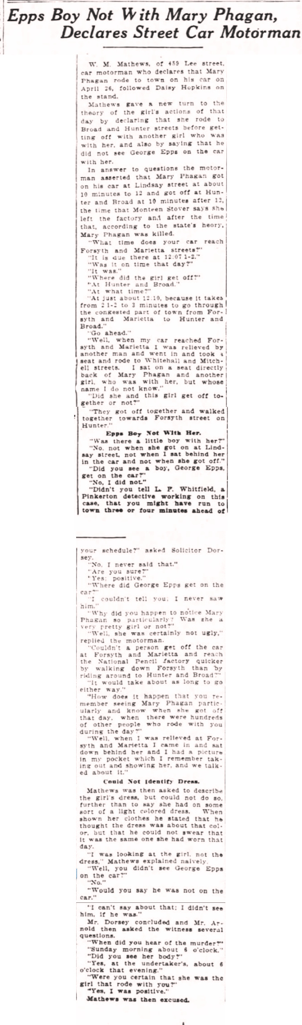 W. M. Mathews, of 459 Lee street, car motorman who declares that Mary Phagan rode to town on his car on April 26, followed Daisy Hopkins on the stand.