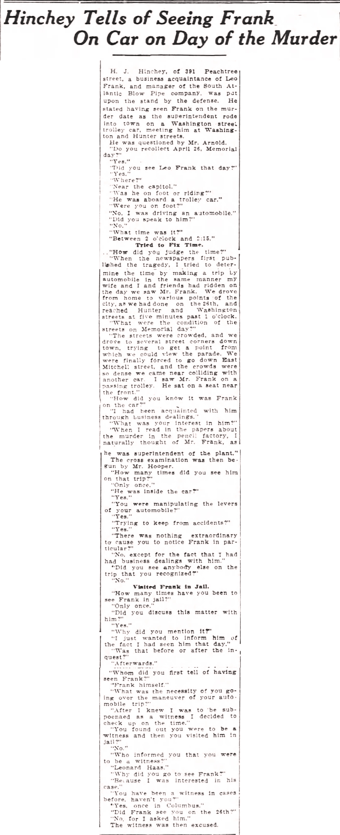 H. J. Hinchey, of 391 Peachtree street, a business acquaintance of Leo Frank, and manager of the South Atlantic Blow Pipe company, was put upon the stand by the defense. He stated having seen Frank on the murder date as the superintendent rode into town on a Washington street trolley car, meeting him at Washington and Hunter streets.