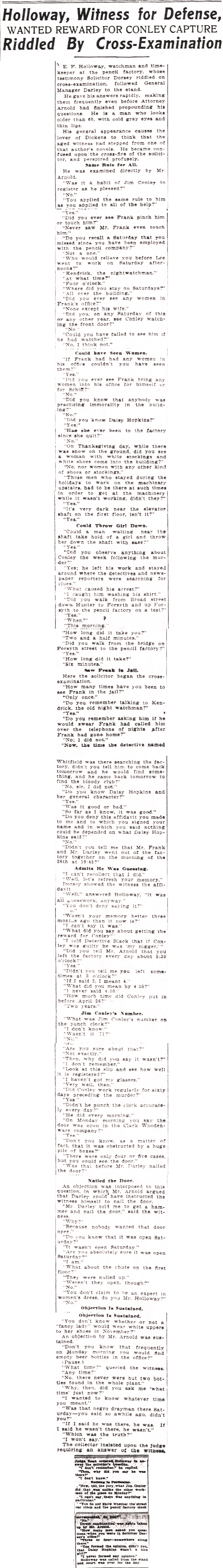 E. F. Holloway, watchman and timekeeper at the pencil factory, whose testimony Solicitor Dorsey riddled on cross-examination, followed General Manager Darley to the stand.