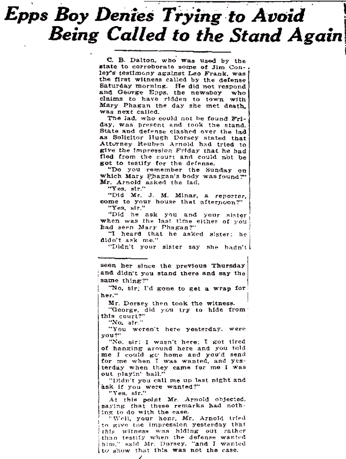 C. B. Dalton, who was used by the state to corroborate some of Jim Conley's testimony against Leo Frank, was the first witness called by the defense Saturday morning. He did not respond and George Epps, the newsboy who claims to have ridden to town with Mary Phagan the day she met death, was next called.
