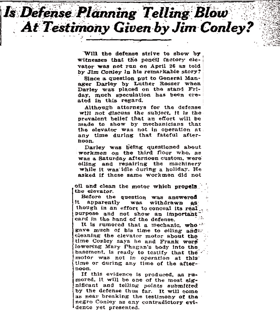 If this evidence is produced, as rumored, it will be one of the most significant and telling points submitted by the defense thus far. It will come as near breaking the testimony of the negro Conley as any contradictory evidence yet presented.