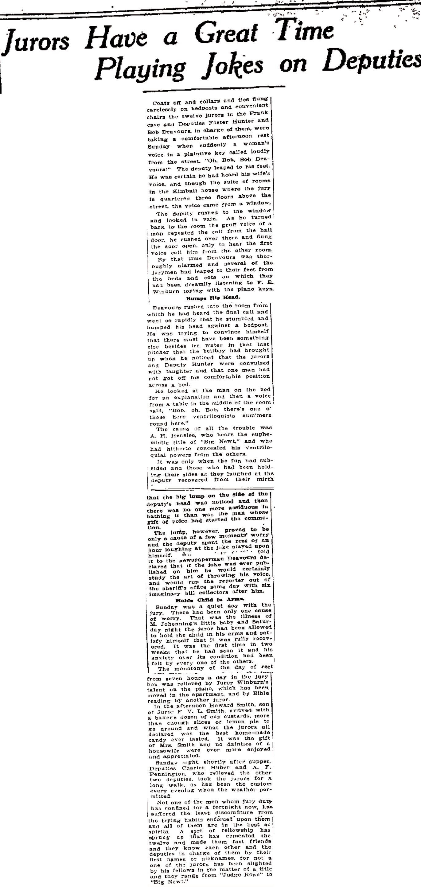 Coats off and collars and ties flung carelessly on bedposts and convenient chairs the twelve jurors in the Frank case and Deputies Foster Hunter and Bob Deavours, in charge of them, were taking a comfortable afternoon rest Sunday when suddenly a woman's voice in a plaintive key called loudly from the street, "Oh, Bob, Bob Deavours!" The deputy leaped to his feet. He was certain he had heard his wife's voice, and though the suite of rooms in the Kimball house where the jury is quartered three floors above the street, the voice came from a window.