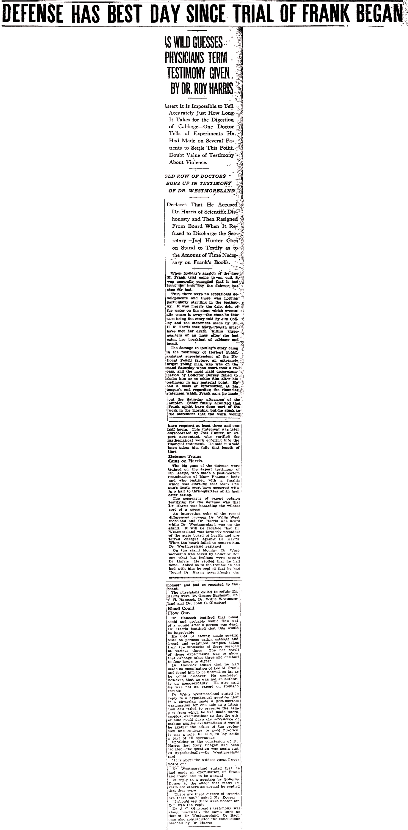 The big guns of the defense were trained on the expert testimony of Dr. Harris, who made a post-mortem examination of Mary Phagan's body and who testified with a finality which was startling that Mary Phagan's death must have occurred within a half to three-quarters of an hour after eating.