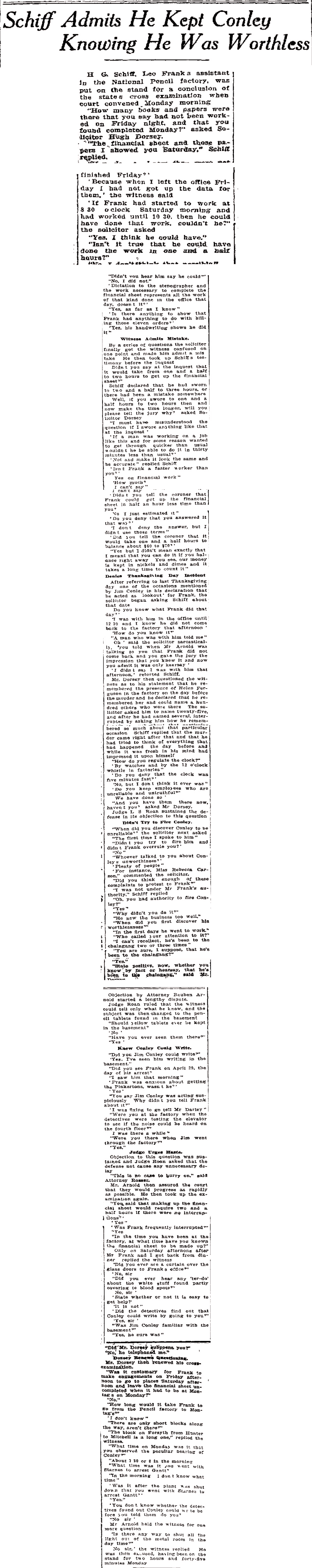 H. G. Schiff, Leo Frank's assistant in the National Pencil factory, was put on the stand for a conclusion of the state's cross examination when court convened Monday morning.