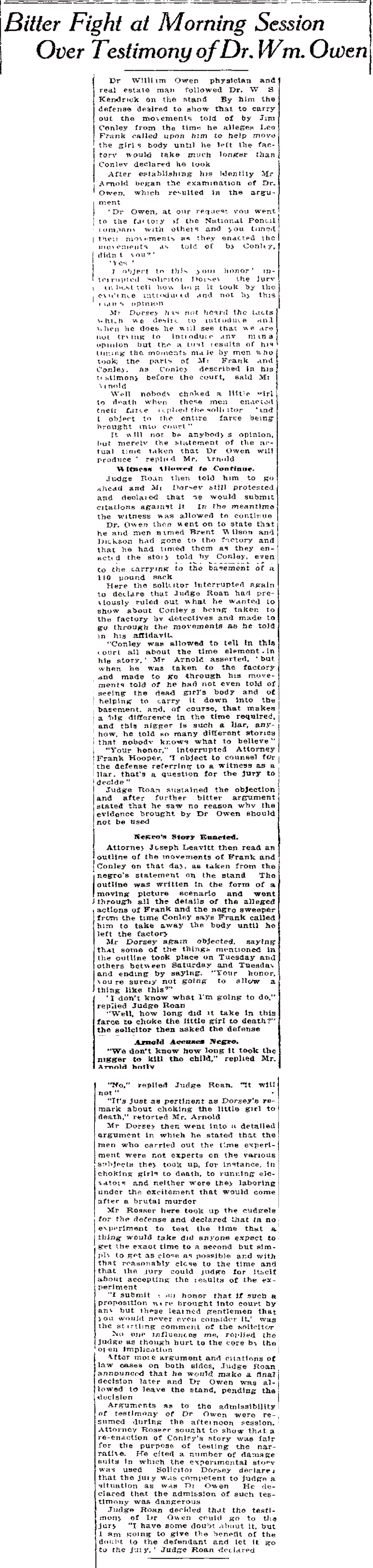 Dr. William Owen, physician and real estate man, followed Dr. W. S. Kendrick on the stand. By him the defense desired to show that to carry out the movements told of by Jim Conley from the time he alleges Leo Frank called upon him to help move the girl's body until he left the factory would take much longer than Conley declared he took.
