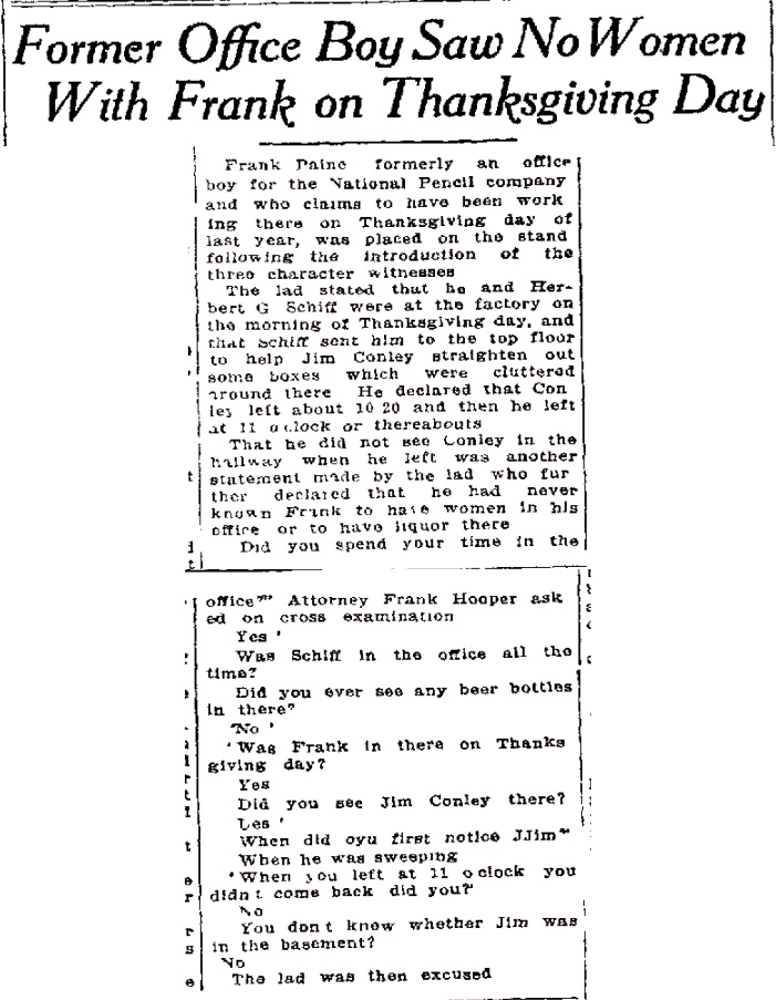 That he did not see Conley in the hallway when he left was another statement made by the lad who further declared that he had never known Frank to have women in his office or to have liquor there.