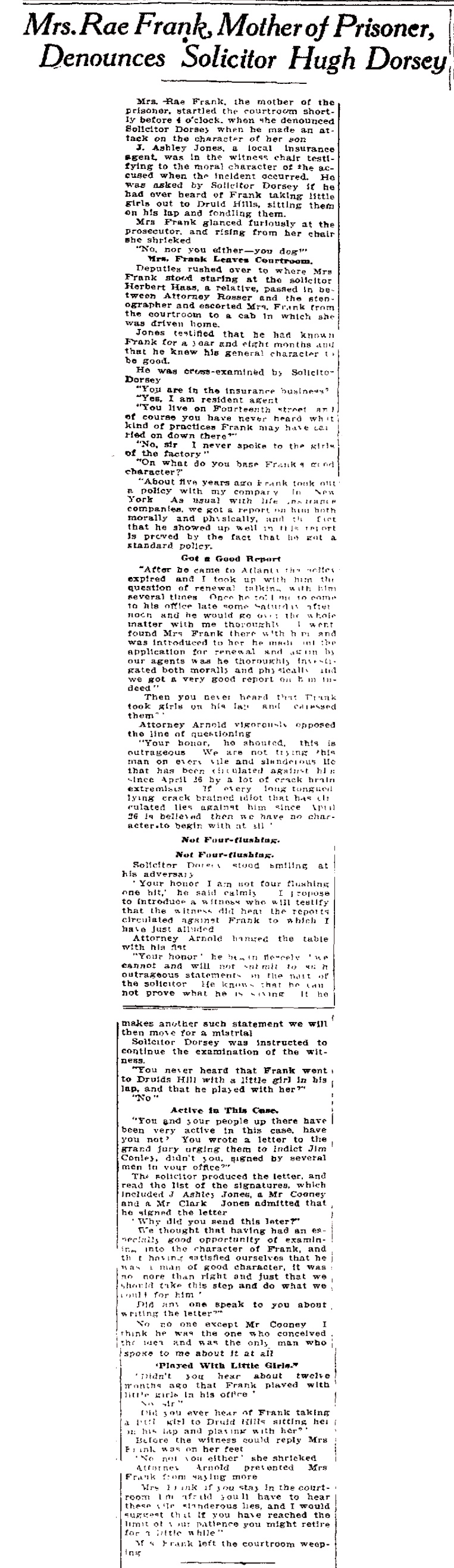 J. Ashley Jones, a local insurance agent, was in the witness chair testifying to the moral character of the accused when the incident occurred. He was asked by Solicitor Dorsey if he had over heard of Frank taking little girls out to Druid Hills, sitting them on his lap and fondling them.