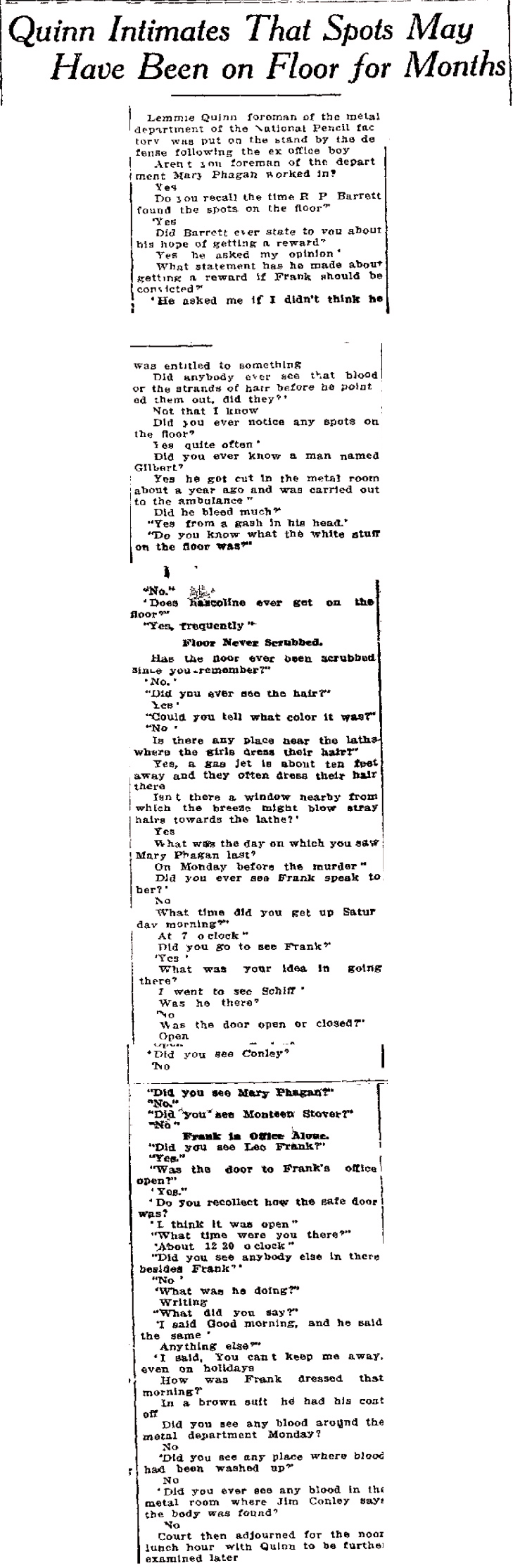"Did you ever see any blood in the metal room where Jim Conley says the body was found?"