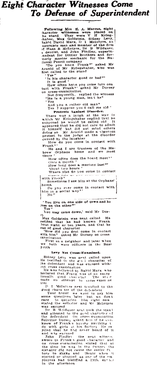 Following Mrs. E. A. Marcus, eight character witnesses were placed on the stand. They were V. H. Kriegshaber, Max Goldstein, Sidney Levy, Rabbi David Marx, D. I. McIntyre, and insurance man and member of the firm of Haas & McIntyre, Dr. B. Wildauer, a dentist, and John Findley, superintendent for Dittler Brothers and formerly master mechanic for the National Pencil company.