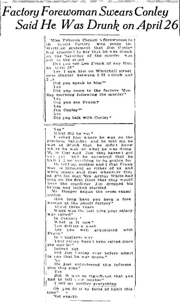Miss Rebecca Carson, a forewoman in the pencil factory, who made the startling statement that Jim Conley had admitted to her that he was drunk on the Saturday of the murder was put on the stand.
