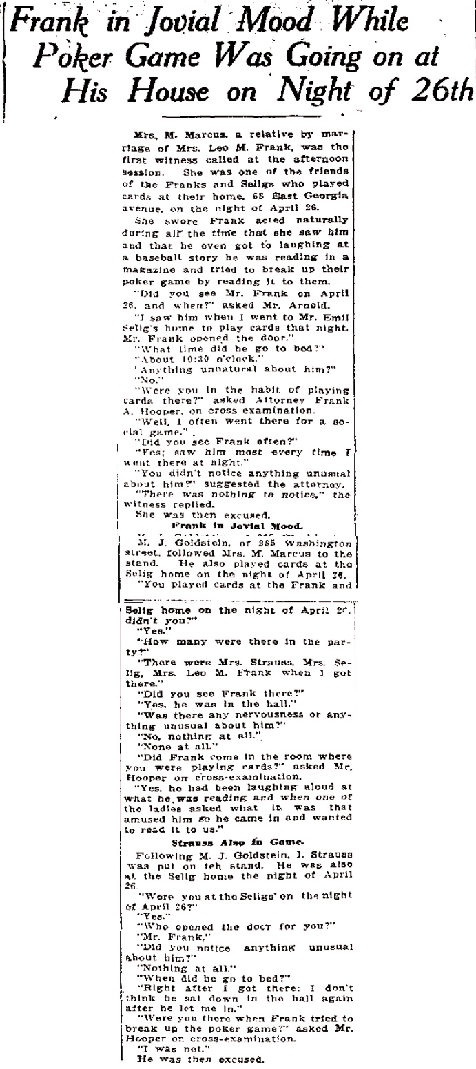 Mrs. M. Marcus, a relative by marriage of Mrs. Leo M. Frank, was the first witness called at the afternoon session. She was one of the friends of the Franks and Seligs who played cards at their home, 68 East Georgia avenue, on the night of April 26.
