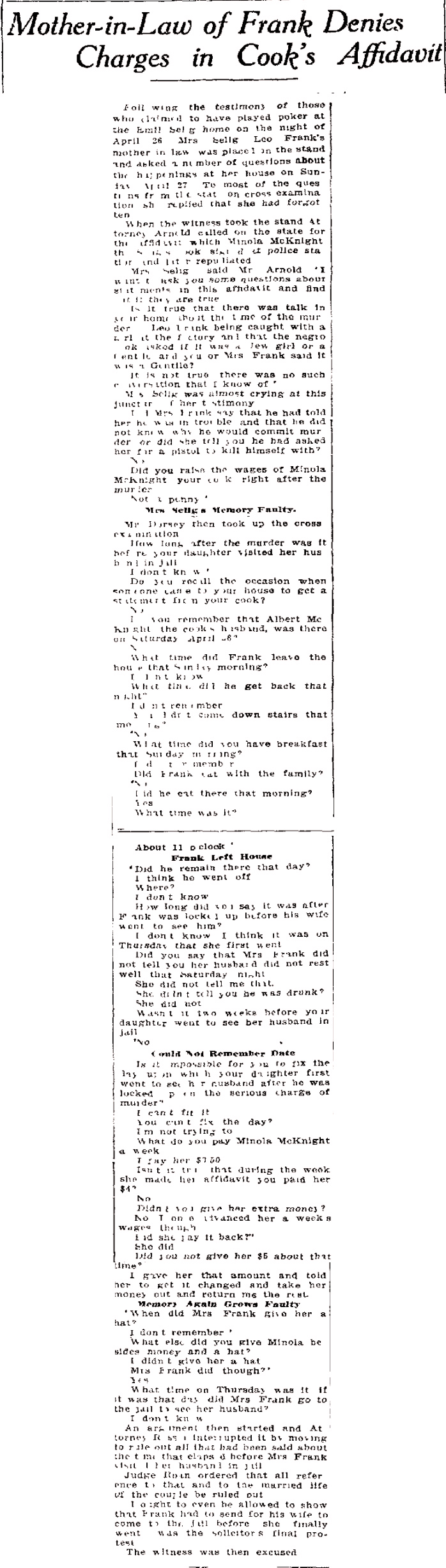 Following the testimony of those who claimed to have played poker at the Emil Selig home on the night of April 26, Mrs. Selig, Leo Frank's mother-in-law was placed on the stand and asked a number of questions about the happenings at her house on Sunday, April 27. To most of the questions from the state on cross-examination she replied that she had forgotten.