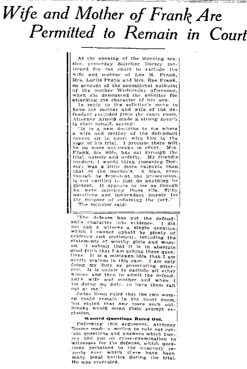 At the opening of the morning session yesterday Solicitor Dorsey motioned for the court to exclude the wife and mother of Leo M. Frank, Mrs. Lucille Frank and Mrs. Rae Frank, on account of the sensational outburst of the mother Wednesday afternoon, when she denounced the solicitor for attacking the character of her son.