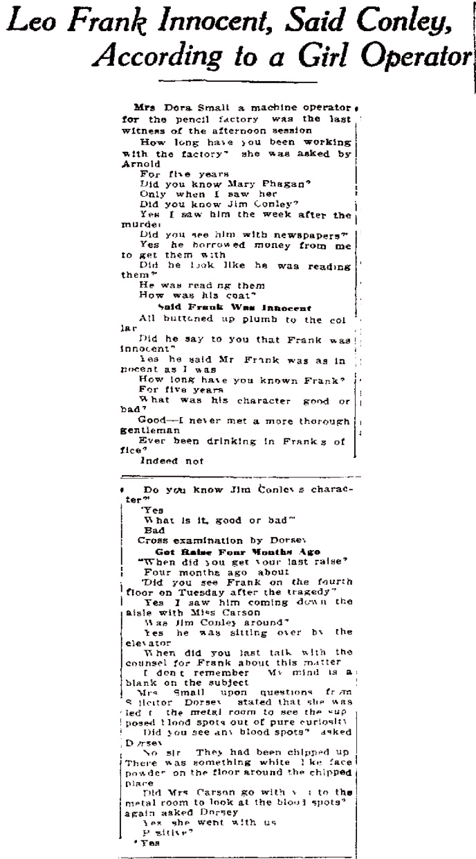Mrs. Dora Small, a machine operator for the pencil factory, was the last witness of the afternoon session.
