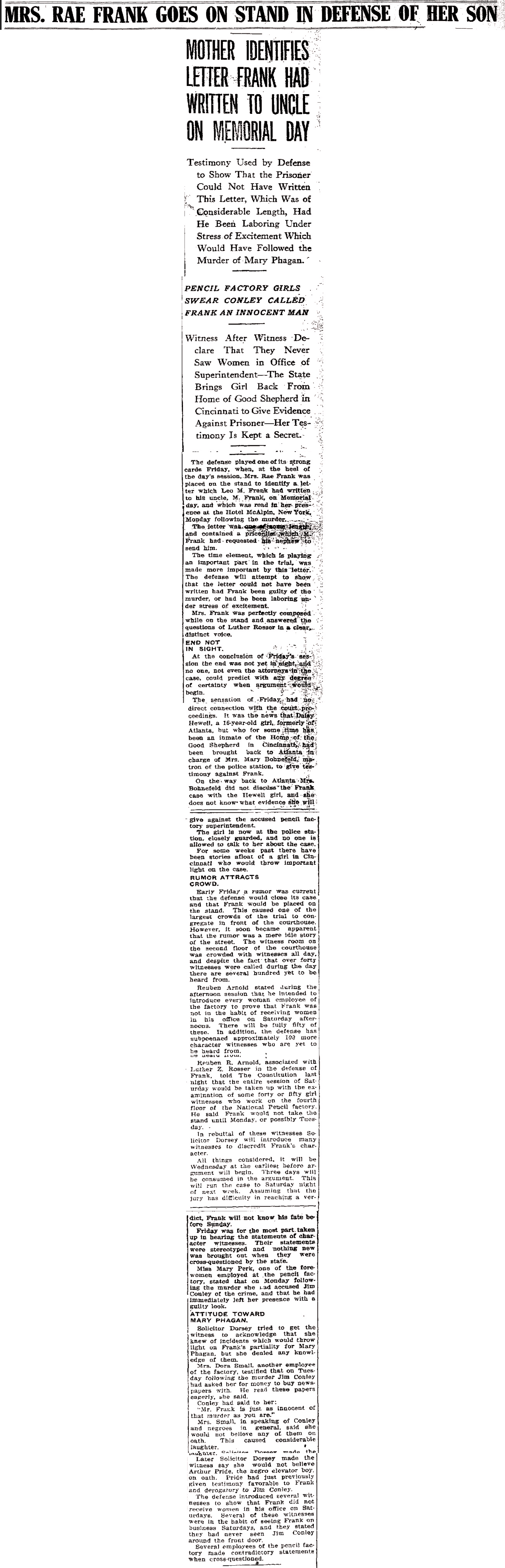 Early Friday a rumor was current that the defense would close its case and that Frank would be placed on the stand. This caused one of the largest crowds of the trial to congregate in front of the courthouse. However, it soon became apparent that the rumor was a mere idle story of the street. The witness room on the second floor of the courthouse was crowded with witnesses all day, and despite the fact that over forty witnesses were called during the day there are several hundred yet to be heard from.