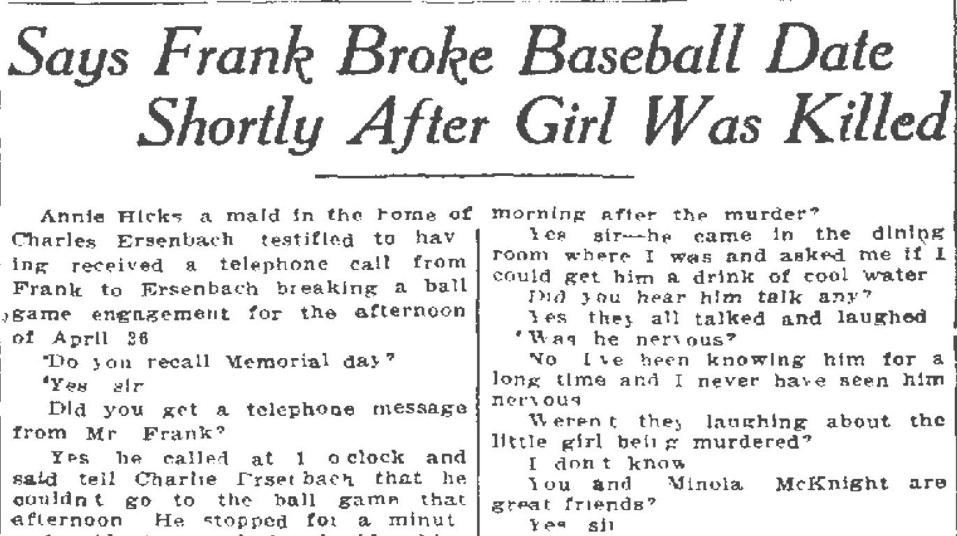 Annie Hicks, a maid in the home of Charles Ersenbach, testified to having received a telephone call from Frank to Ersenbach, breaking a ball game engagement for the afternoon of April 26.