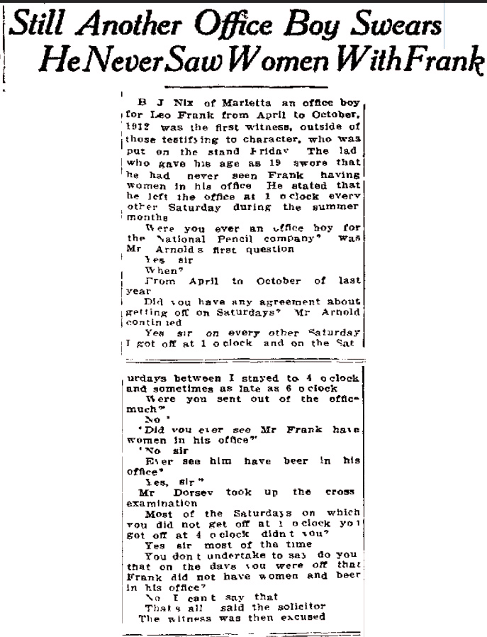 B. J. Nix, of Marietta, an office boy for Leo Frank from April to October, 1912 was the first witness, outside of those testifying to character, who was put on the stand Friday. The lad who gave his age as 19 swore that he had never seen Frank having women in his office. He stated that he left the office at 1 o'clock every other Saturday during the summer months.