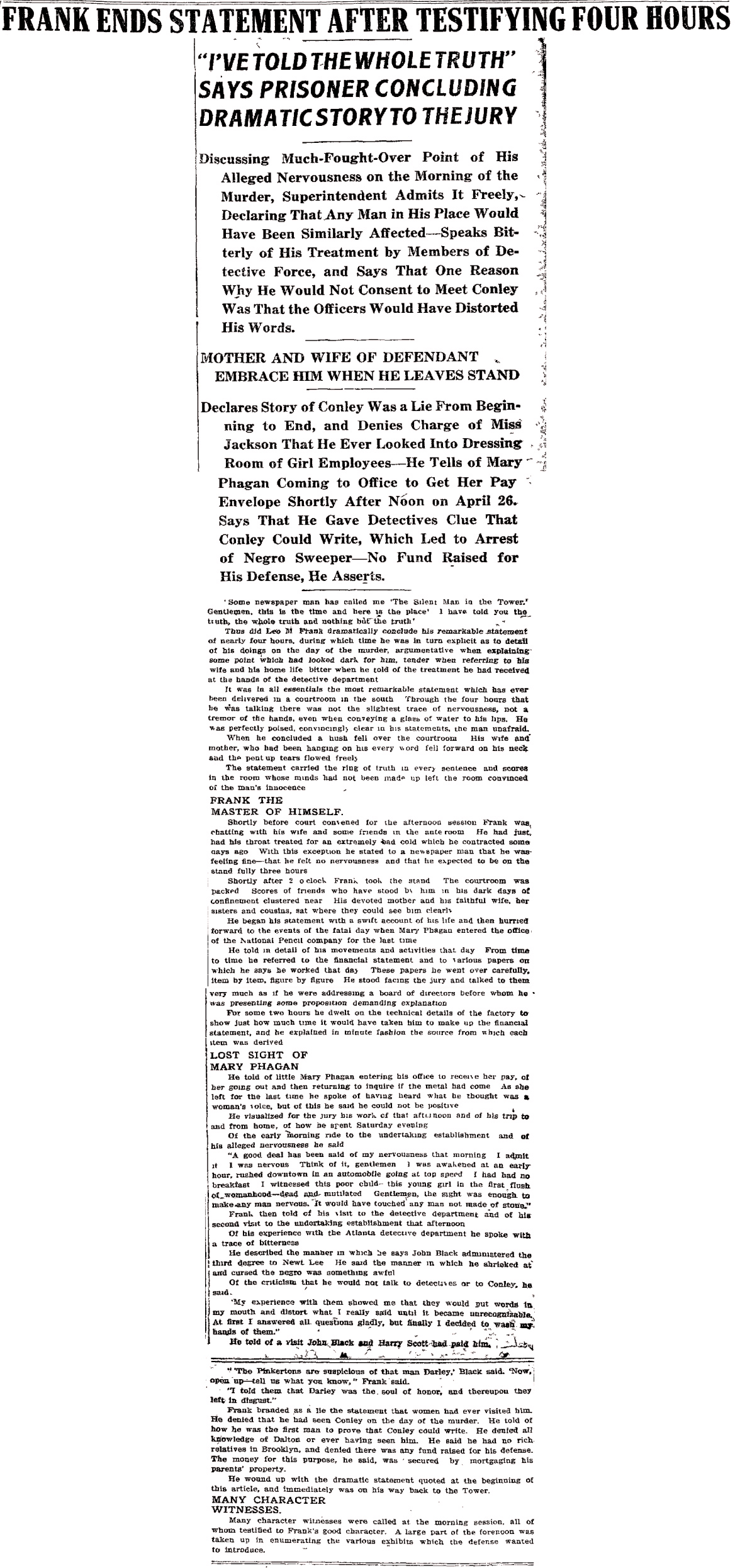 Thus did Leo M. Frank dramatically conclude his remarkable statement of nearly four hours, during which then he was in turn explicit as to detail of his doings on the day of the murder, argumentative when explaining some point which had looked dark for him, tender when referring to his wife and his home life, bitter when he told of the treatment he had received at the hands of the detective department.