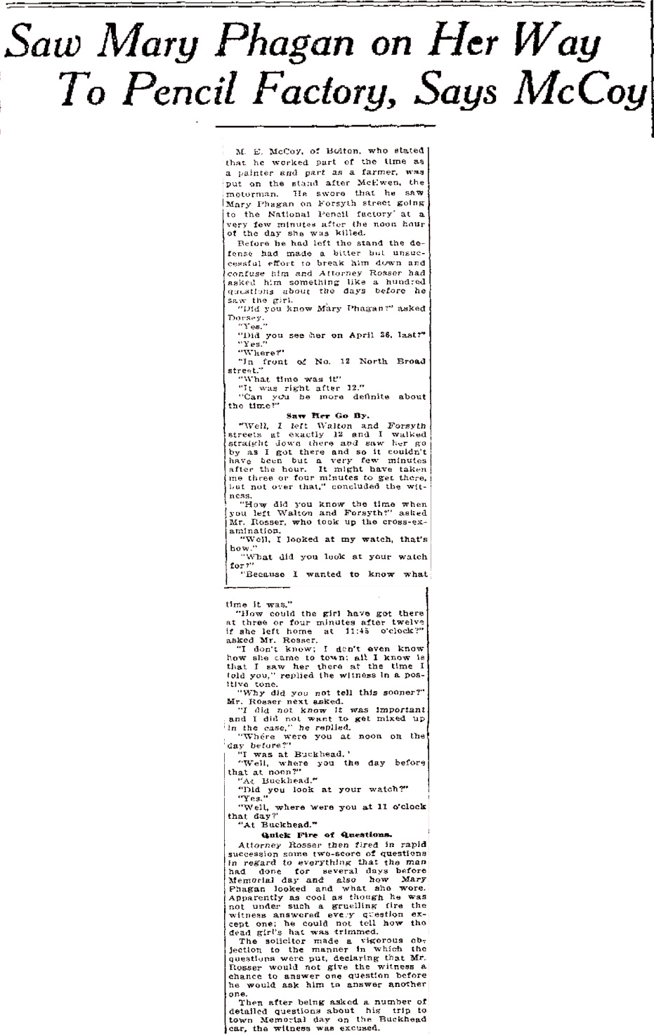 M. E. McCoy, of Bolton, who stated that he worked part of the time as a painter and part as a farmer, was put on the stand after McEwen, the motorman. He swore that he saw Mary Phagan on Forsyth street going to the National Pencil factory at a very few minutes after the noon hour of the day she was killed.
