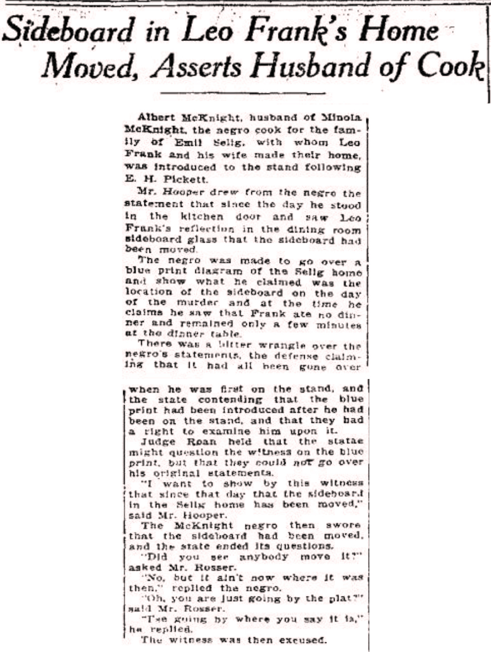 Albert McKnight, husband of Minola McKnight, the negro cook for the family of Emil Selig, with whom Leo Frank and his wife made their home, was introduced to the stand following E. H. Pickett.