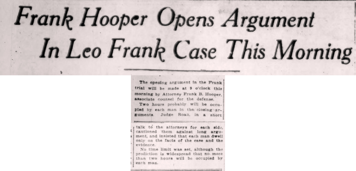 The opening argument in the Frank trial will be made at 9 o’clock this morning by Attorney Frank B. Hooper, associate counsel for the defense.