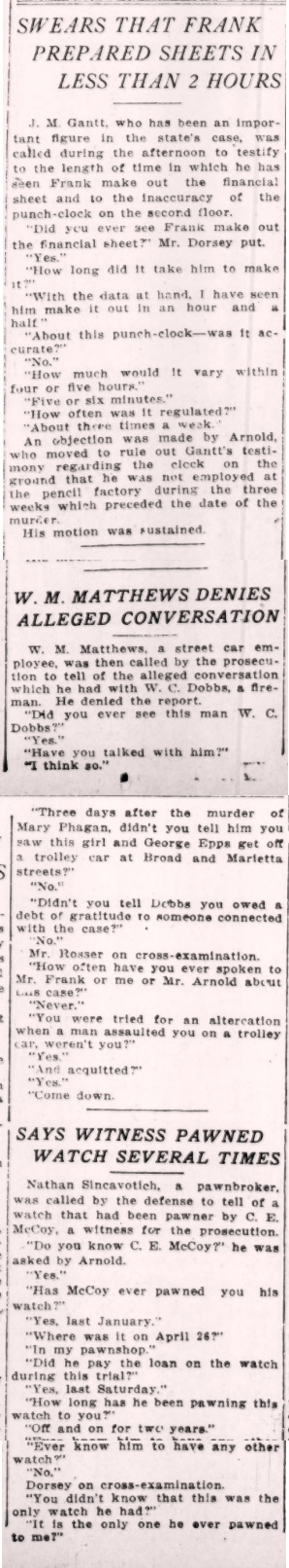 J. M. Gantt, who has been an important figure in the state's case, was called during the afternoon to testify to the length of time in which he has seen Frank make out the financial sheet and to the inaccuracy of the 'punch-clock on the second floor.
