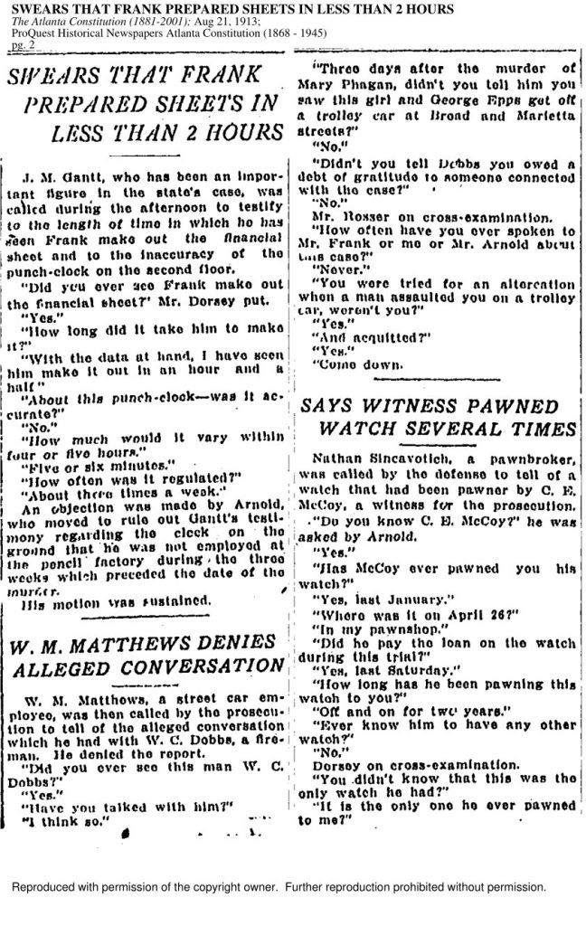 J. M. Gantt, who has been an important figure in the state's case, was called during the afternoon to testify to the length of time in which he has seen Frank make out the financial sheet and to the inaccuracy of the 'punch-clock on the second floor.