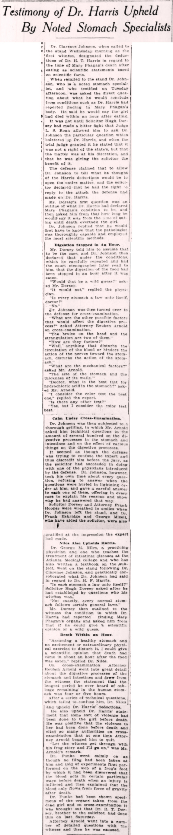 Dr. George M. Niles, a practicing physician and one who teaches the treatment of intestinal diseases at the Atlanta Medical college and who has also written a textbook on the subject, went on the stand following Dr. Clarence Johnson, and practically corroborated what Dr. Johnson had said in regard to Dr. H. F. Harris.
