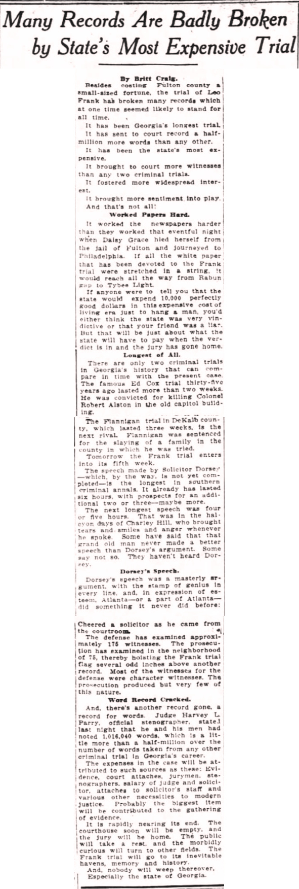 And, there's another record gone, a record for words: Judge Harvey L. Parry, official stenographer, stated last night that he and his men had noted 1,016,040 words, which is a little more than a half-million over the number of words taken from any other criminal trial in Georgia's career.
