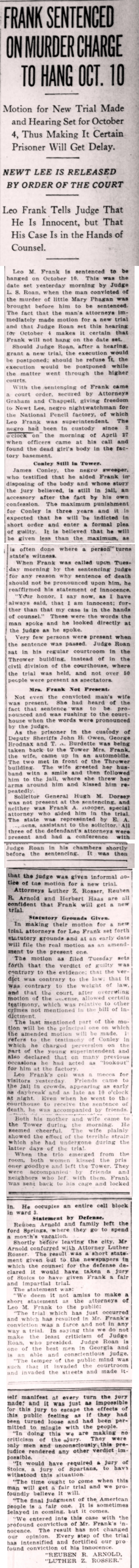 Leo M. Frank is sentenced to be hanged on Friday, October 10, 1913. This was the date set yesterday morning by Judge Leonard Strickland Roan, when the man convicted of the murder of little Mary Phagan was brought before him to be sentenced on Tuesday, August 26. The fact that the man's attorneys immediately made motion for a new trial and that Judge Roan set this hearing for October 4 makes it certain that Frank will not hang on the date set.