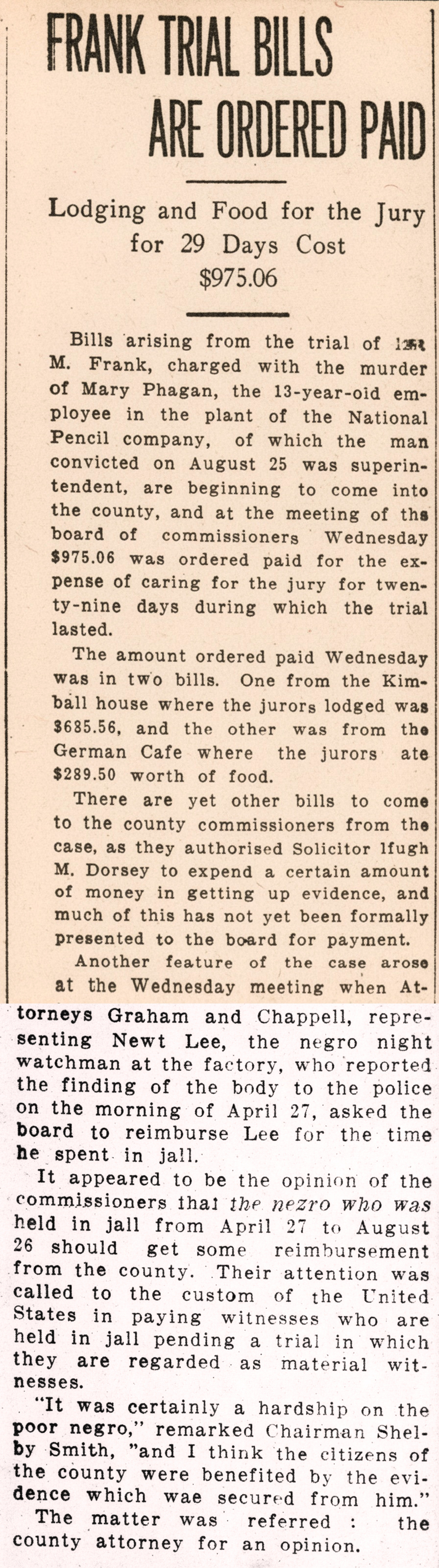 Bills arising from the trial of Leo M. Frank, charged with the murder of Mary Phagan, the 13-year-old employee in the plant of the National Pencil company, of which the man convicted on August 25, 1913 was superintendent, are beginning to come into the county, and at the meeting of the board of commissioners Wednesday $975.06 was ordered paid for the expense of caring for the jury for twenty-nine days during which the trial lasted.