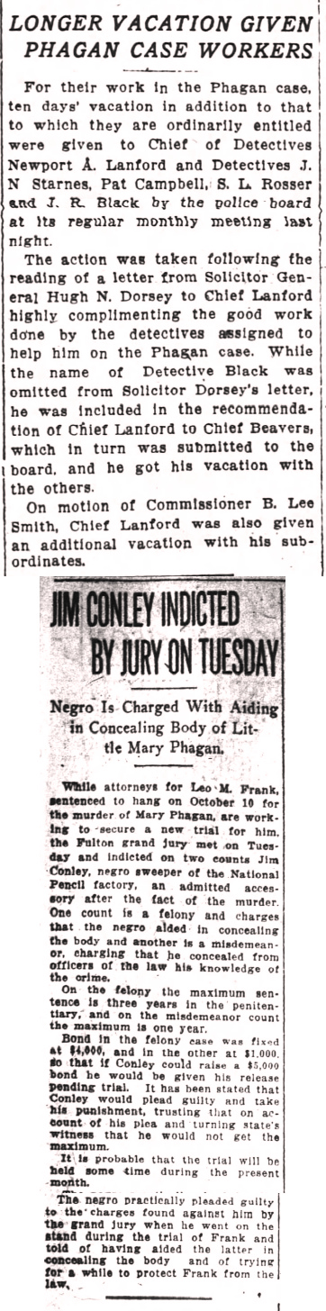 The action was taken following the reading of a letter from Solicitor General Hugh N. Dorsey to Chief Lanford highly complimenting the good work done by the detectives assigned to help him on the Phagan case. While the name of Detective Black was omitted from Solicitor Dorsey's letter, he was included in the recommendation of Chief Lanford to Chief Beavers, which in turn was submitted to the board, and he got his vacation with the others.