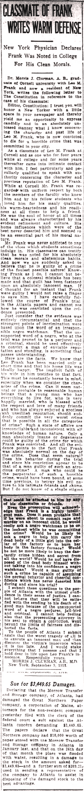 Dr. Morris J. Clurman, A. B., graduate of Cornell university with Leo M. Frank and now a resident of New York, writes the following letter to The Constitution in reference to the case of his classmate: