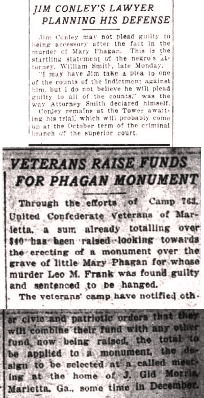 Through the efforts of Camp 763, Unite Confederate Veterans of Marietta, a sum already totaling over $40 has been raised looking towards the erecting of a monument over the grave of little Mary Phagan for whose murder Leo M. Frank was found guilty and sentenced to be hanged.