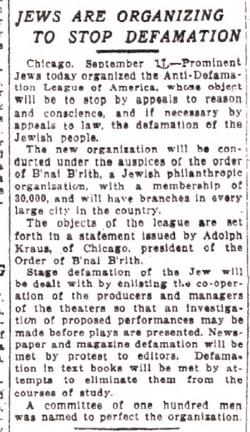 Chicago. September 17 Prominent Jews today organized the Anti-Defamation League of America, whose object will be to stop by appeals to reason and conscience, and if necessary, by appeals to law, the defamation of the Jewish people.
