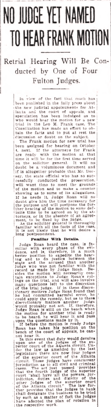 In view of the fact that much has been published in the daily press about the new judicial appointments for Atlanta and the court of appeals, and speculation has been indulged as to who would hear the motion for a new trial in the Leo M. Frank case.