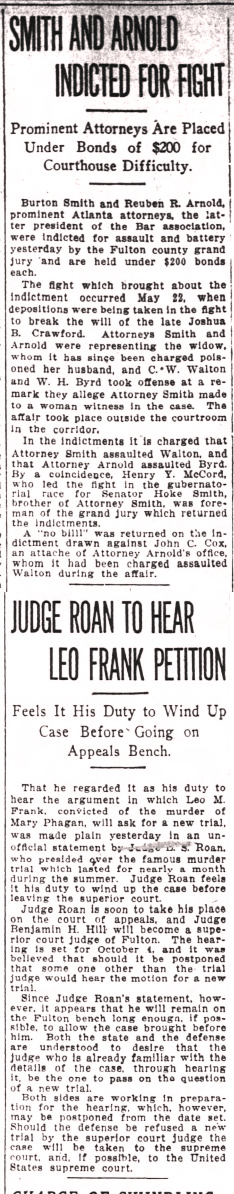 In the indictments it is charged that Attorney Smith assaulted Walton, and that Attorney Arnold assaulted Byrd. By a coincidence, Henry Y. McCord, who led the fight in the gubernatorial race for Senator Hoke Smith, brother of Attorney Smith, was foreman of the grand jury which returned the indictments.