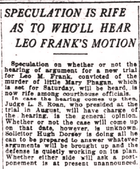In case the hearing comes up then, Judge L. S. Roan, who presided at the trial in August, will have charge of the hearing, is the general opinion. Whether or not the case will come up on that date, however, is unknown. Solicitor Hugh Dorsey is doing all he can to be prepared to answer whatever arguments will be brought up and the defense is quietly working on its plan. Whether either side will ask a postponement is at present unannounced.