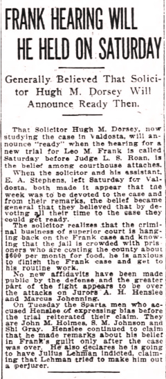 That Solicitor Hugh M. Dorsey, now studying the case in Valdosta, will announce ready when the hearing for a new trial for Leo M. Frank is called Saturday before Judge