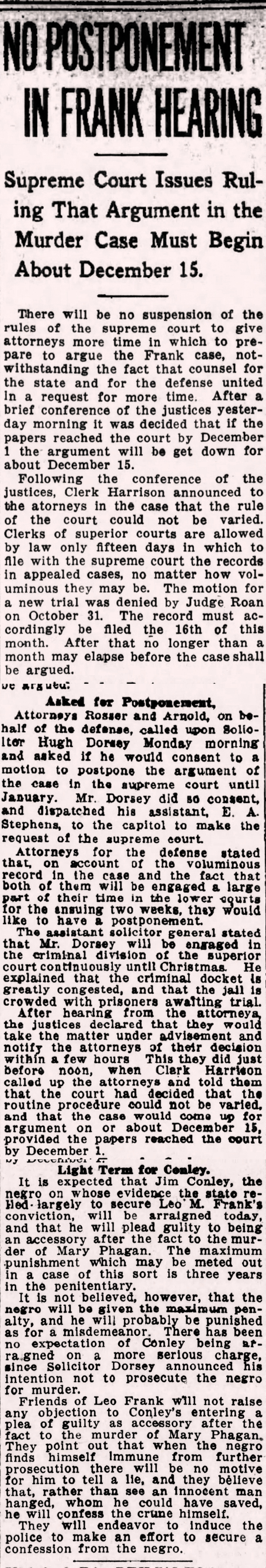 - 0652) Monday, 30th November 1914: No Delay Expected In Leo Frank Case, The Atlanta Constitution [Last Updated On: July 9th, 2025] [Originally Added On: July 8th, 2025]
