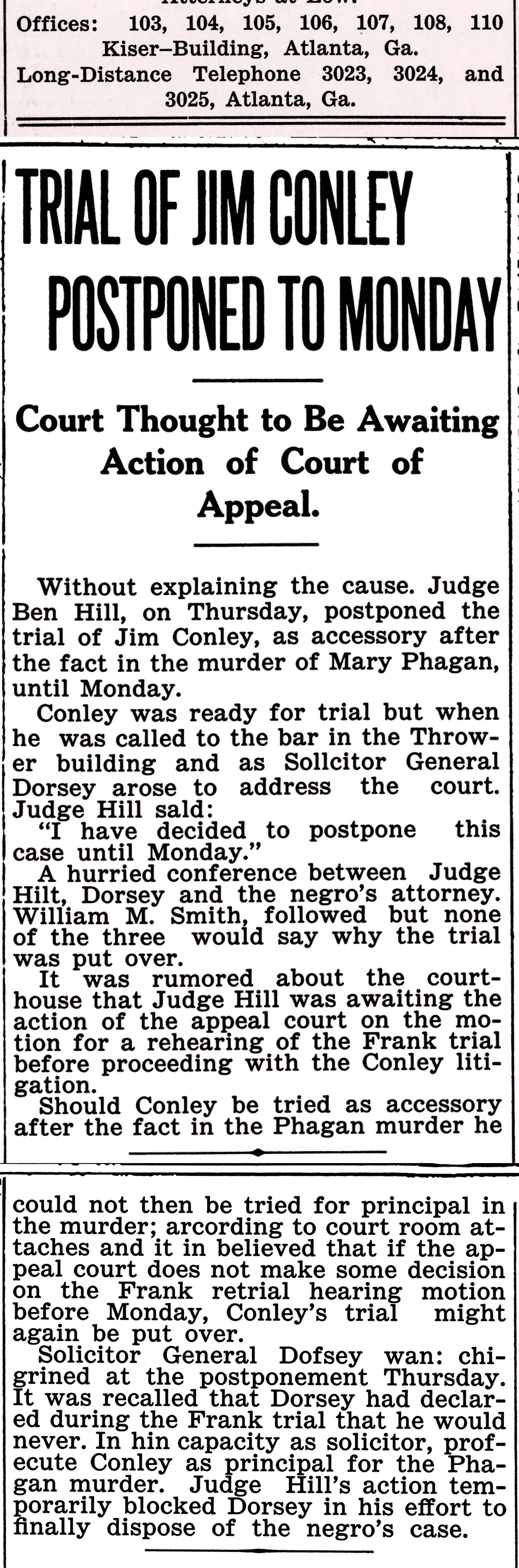 Ben Hill, on Thursday, postponed the trial of Jim Conley, as accessory after