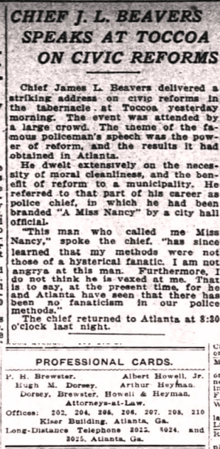 "This man who called me Miss Nancy," spoke the chief, "has since learned that my methods were not those of a hysterical fanatic. I am not angry at this man. Furthermore, I do not think he is vexed at me. That is to say, at the present time, for the and Atlanta have seen that there has been no fanaticism in our police methods."