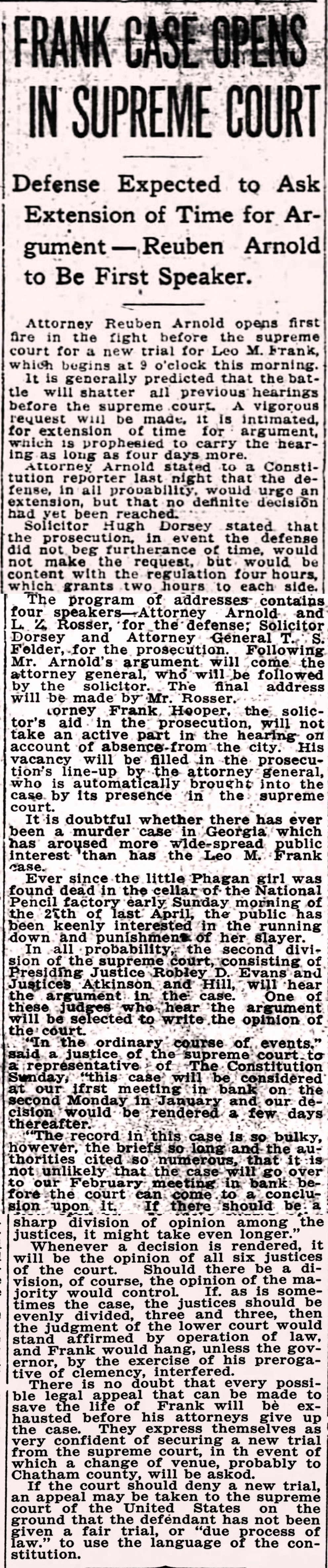 Attorney Reuben Arnold opens first fire in the fight before the supreme court for a new trial for Leo M. Frank, which begins at 9 o'clock this morning.