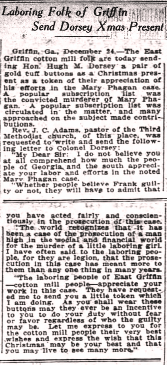 The East Griffin cotton mill folk are today sending Hon. Hugh M. Dorsey a pair of gold cuff buttons as a Christmas present as a token of their appreciation of his efforts in the Mary Phagan case.