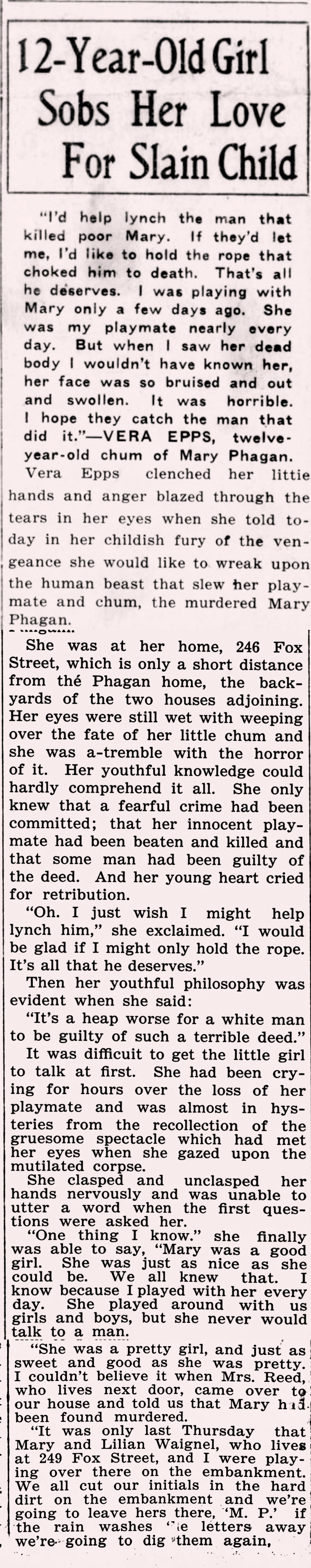 "I'd help lynch the man that killed poor Mary. If they'd let me, I'd like to hold the rope that choked him to death. That's all he deserves. I was playing with Mary only a few days ago. She was my playmate nearly every day. But when I saw her dead body I wouldn't have known her, her face was so bruised and out and swollen. It was horrible. I hope they catch the man that did it."—VERA EPPS, twelve-year-old chum of Mary Phagan.