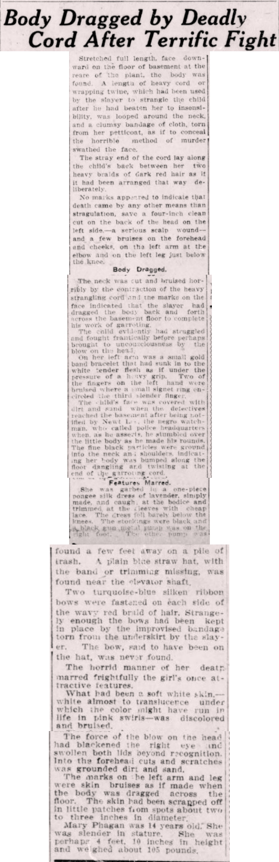 Stretched full length, face downward on the floor of the basement at the rear of the plant, the body was found. A length of heavy cord or wrapping twine, which had been used by the slayer to strangle the child after he had beaten her to insensibility, was looped around the neck, and a clumsy bandage of cloth, torn from her petticoat, as if to conceal the horrible method of murder swathed the face.
