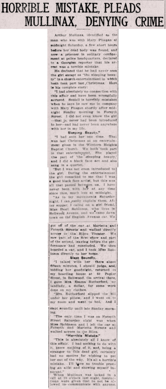 Arthur Mullinax, identified as the man who was with Mary Phagan at midnight Saturday, a few short hours before her dead body was found, and now a prisoner in solitary confinement at police headquarters, declared to a Georgian reporter that his arrest was a terrible mistake.