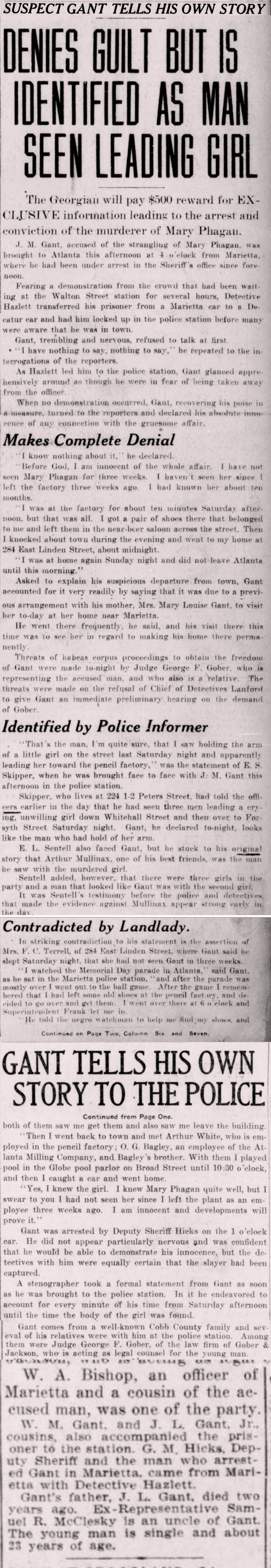 "I watched the Memorial Day parade in Atlanta," said Gantt, as he sat in the Marietta police station, "and after the parade was mostly over I went out to the ball game. After the game, I remembered that I had left some old shoes at the pencil factory, and decided to go over and get them. I went over there at 6 o'clock and Superintendent Frank let me in.