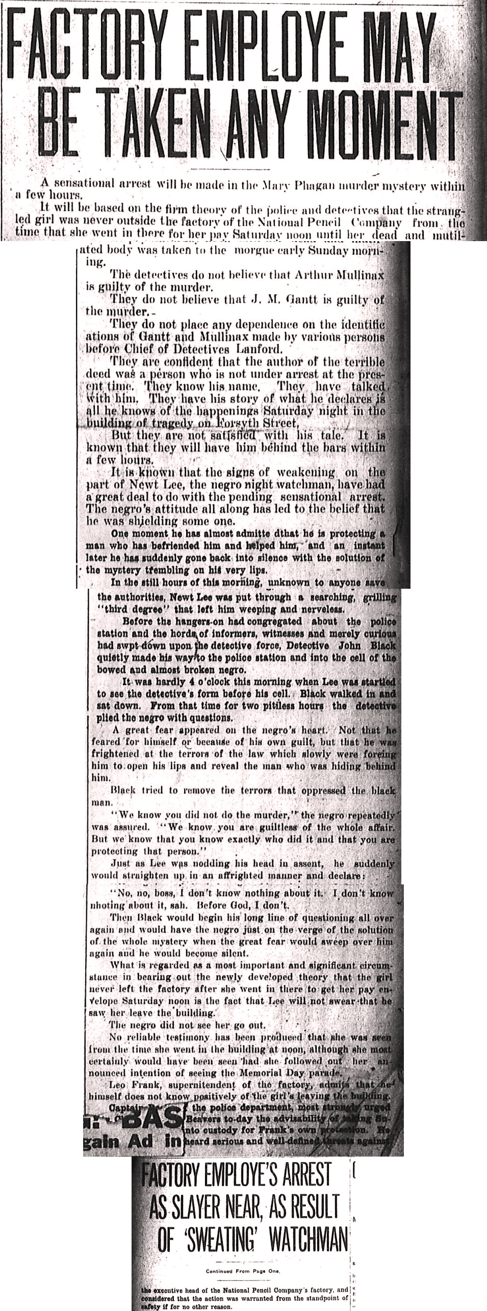 ![Gantt reading murder warrant [John M. Gantt was a family friend of Mary Phagan's and was accused of being "infatuated" with the young girl. He was let into the factory on Saturday to retrieve pairs of shoes he had left there prior to his leaving the company. Newt Lee accompanied him as he retrieved his shoes and left Saturday afternoon -- Ed.]](https://www.leofrank.com/images/archive-atlanta-georgian/Factory-Employe-May-Be-Taken-Any-Moment-300x483.png)