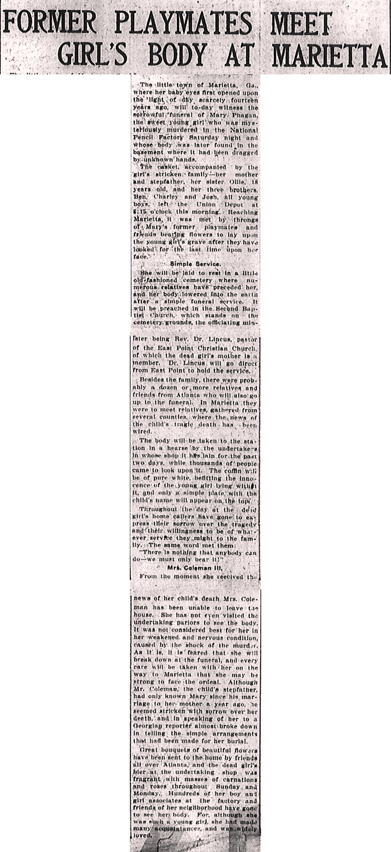 The little town of Marietta, Georgia, where her baby eyes first opened upon the light of day scarcely fourteen years ago, will to-day witness the sorrowful funeral of Mary Phagan, the sweet young girl who was mysteriously murdered in the National Pencil Factory Saturday night and whose body was later found in the basement where it had been dragged by unknown hands.